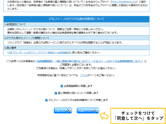 5. 会員組織規則、個人情報取り扱い、デルフィーノのデジタル版利用要項についてチェックし、「同意して次へ」をタップ