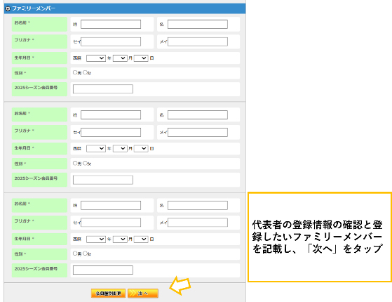 4. 代表者の登録情報の確認と登録したいファミリーメンバー(追加メンバーも含め)を記載し、「次へ」をタップ※ファミリーメンバーの会員番号を記載がない場合は年数が引き継がれませんのでご注意ください