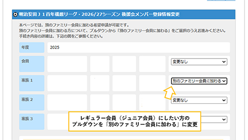 3. レギュラー会員(ジュニア会員)となる方のプルダウンを「別のファミリー会員に加わる」に変更し、申請する