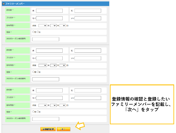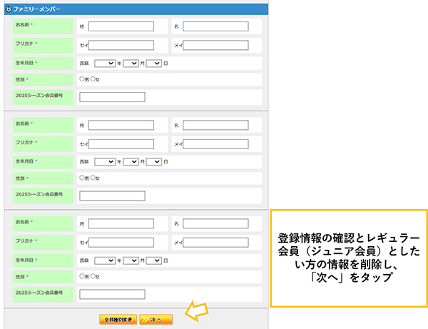 6. 代表者の登録情報の確認とレギュラー会員(ジュニア会員)とする方の情報を削除して、「次へ」をタップ