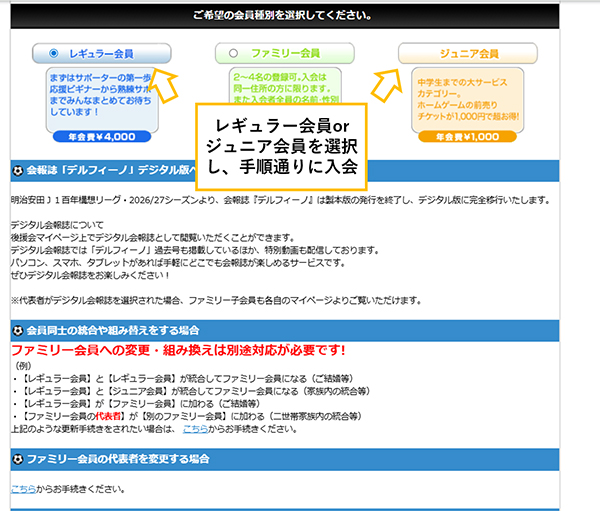 2. 会員種別にてレギュラー会員(ジュニア会員)を選択し、手順通りに入会手続き