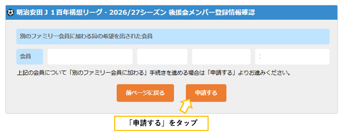 1. ファミリー会員に加わるレギュラー会員(ジュニア会員)が後援会マイページにログインし、「後援会更新はこちら」をタップ