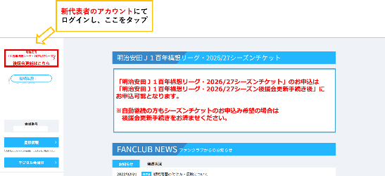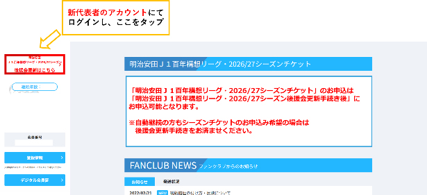 1. 新代表者にてJリーグIDの作成およびワンタッチIDの紐づけを行い、後援会マイページへログイン⇒「後援会更新はこちら」をタップ