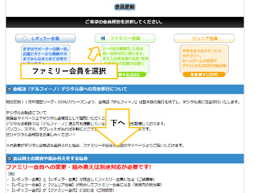 4.後援会更新に戻り、会員種別にて「ファミリー会員」を選択