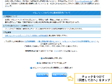 3. 会員組織規則、個人情報取り扱い、デルフィーノのデジタル版利用要項についてチェックし、「同意して次へ」をタップ