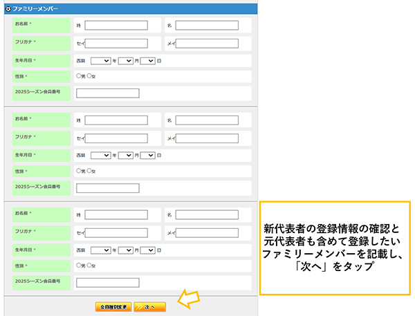 ファミリー会員の変更および代表者の変更は必ず更新前に対応が必要です。