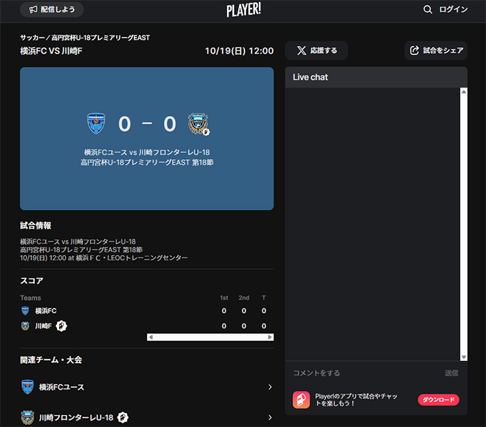 今シーズンもフロンターレアカデミーの選手たちの戦いぶりをタイムリーに皆さんにお届けするため、スポーツライブエンターテイメントアプリ「Player!」にて試合速報を実施します。