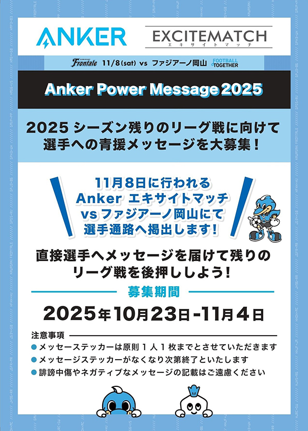 11月8日(土)に行われる明治安田J1リーグ第36節 ファジアーノ岡山戦での「Ankerエキサイトマッチ」開催を記念して、「Anker Power MESSAGE」を募集いたしますので、お知らせいたします。