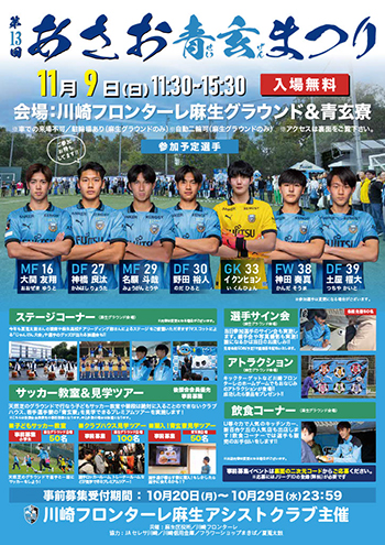 川崎フロンターレ麻生アシストクラブ主催の「第13回あさお青玄(せいげん)まつり」が11月9日(日)に開催されますので、お知らせいたします。