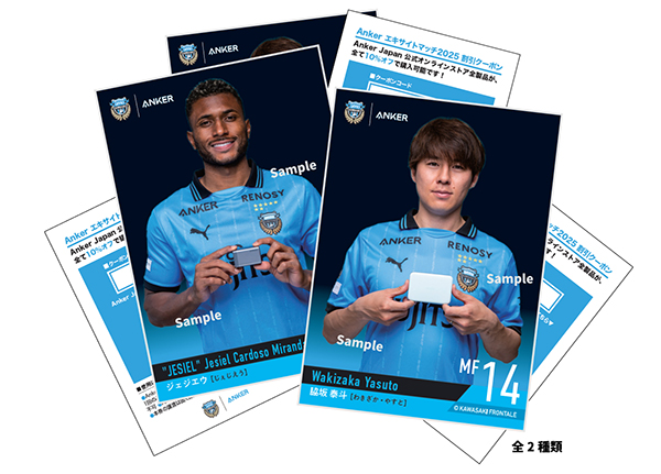 | 抽選方法 | 入場時にBandieraゲート、7番ゲート、8番ゲート、10番ゲートにて抽選ナンバー付ポストカードを先着10,000名様に配布します(ビジター席を除く)。 ハーフタイムに大型ビジョンで当選発表いたしますので、ご自身の抽選番号をご確認ください。最新のAnkerグループ製品や当日選手が着用したAnker | PUMA限定Tシャツなど豪華景品をプレゼント!! |