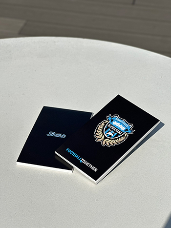 「試合中にスーツのポケットに入るサイズのメモ帳が重宝しているんだよね。」という長谷部監督の一言から製作が決定! 片面にピッチを、片面には何でも書き込める罫線をデザインしているので、試合中や試合後にこの試合はこうだったな...!など、長谷部監督気分を味わえるかも!?