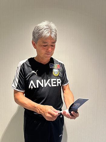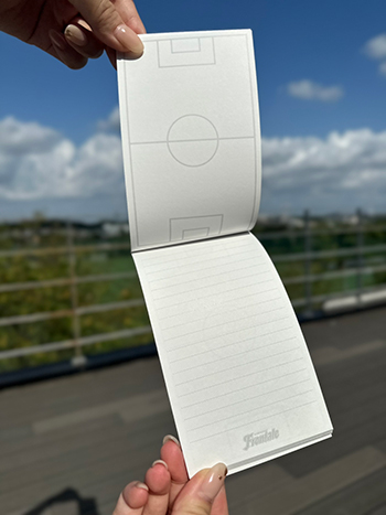 サイズなども長谷部監督に聞きながら、こだわって製作しました。すでに見かけた方もいらっしゃるかもしれませんが...。試合中に長谷部監督がすでに愛用中の闘将メモ帳をぜひお手元に。