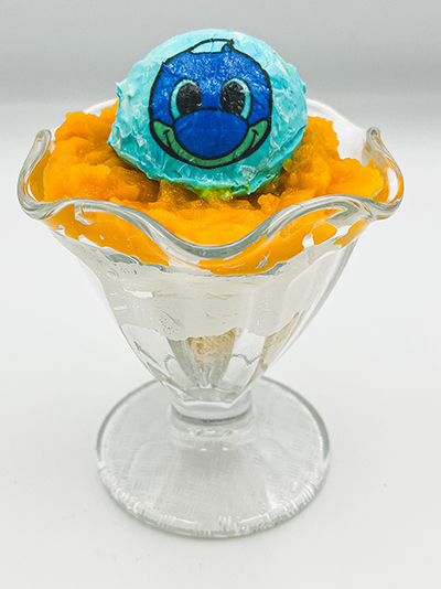見ても食べても楽しい! かわいいふろん太モチーフのアイスに甘いマンゴージュレ、さっぱりしたレアチーズケーキ、底にアクセントになるザクザククランブルが敷き詰められています。見た目や味はもちろん、食感もお楽しみいただけます!