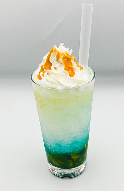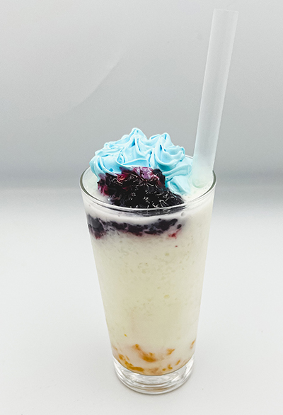 フロンターレイメージの青×オレンジカラーのドリンク! さっぱりなヨーグルトとマンゴー、ブルーベリーの甘酸っぱさが試合後のアツさに染みる! 混ぜて味の変化もお楽しみください。