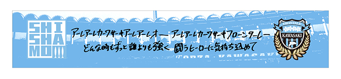 等々力に轟く「明日も」を原曲にしたチャントは、選手・スタッフのみならず、スタンドの多くのファン・サポーターの背中を大きく後押ししています。そんなチャントの歌詞をGt.Vo 宮崎朝子さんによる手描きデザイン!! “明日も”もちろん、“これからも”等々力にはこのチャントが轟き続ける。