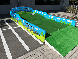 | ルール | ・1人2球チャレンジ。 ・湾曲した壁にボールを蹴り、壁のボールを転がして反対側のピンを倒そう! 結果に応じて景品をプレゼント! |