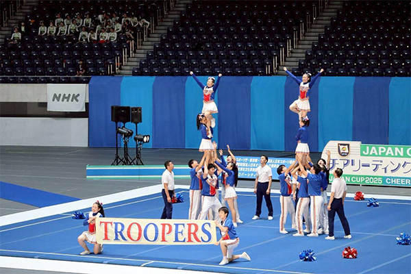 川崎市立高津高校チアリーディング部、TROOPERSです! 私たちは、全国でも珍しい「男女混成チーム」として活動しています。夏と冬に行われる全国大会で決勝に進出することを目標に、日々の練習に励んでいます。
