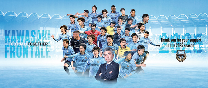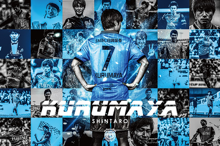 フロンターレ在籍中に駆け上がったプレー写真を始め、さまざまな場面を散りばめた写真を背景に、川崎の漢である偉大な背中を大きくデザインしました。
