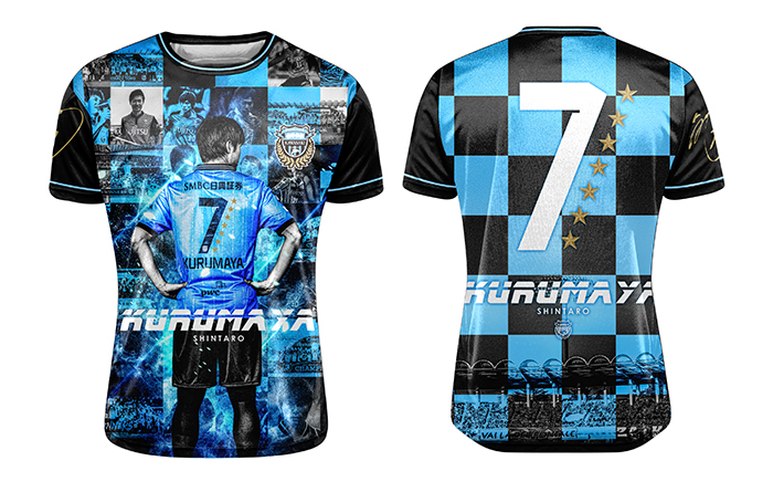 前面にはメインビジュアルをベースに、背面には背番号の7と同じくシンタロウと共に勝ち取ってきた7つの星がデザインされています。青黒を背負ってきたシンタロウを表現するチェック柄となっています。