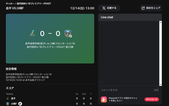今シーズンもフロンターレアカデミーの選手たちの戦いぶりをタイムリーに皆さんにお届けするため、スポーツライブエンターテイメントアプリ「Player!」にて試合速報を実施します。