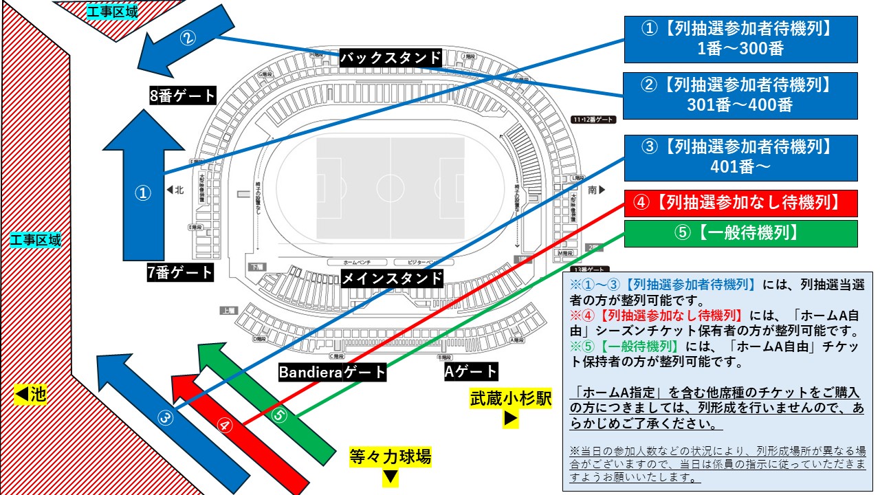 等々力緑地再編整備工事に伴い、8番ゲート付近の列形成スペースが大きく縮小しております。そのため、明治安田J1百年構想リーグ EAST第1節より、列形成場所を昨シーズンの位置から変更しております。