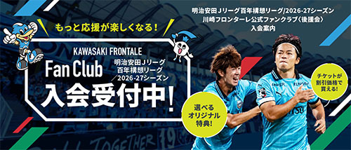 | 内容 | ◇明治安田J1百年構想リーグ・2026/27シーズン川崎フロンターレ 公式ファンクラブ〈後援会〉入会受付今回もお得な入会特典が盛りだくさん!!