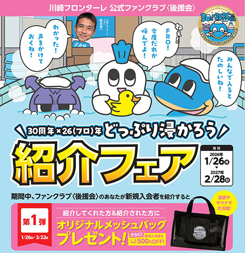 特典などの詳細はこちらから ◇30周年×26(フロ)年どっぷり浸かろう 紹介フェア第1弾クラブ創設30周年という大きな節目とフロンターレとして大切な数字の20“26”(フロ)年を記念して、「30周年×26(フロ)年どっぷり浸かろう」と題し、シーズンを通して企画を実施します!!