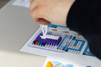 毎回大人気の手作りコーナー。アイロンビーズを並べて描く推し選手の背番号と、ドールランド春にちなんだフルーツモチーフのチャームを組み合わせたオリジナルキーホルダーが簡単に作れます。